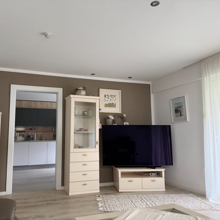 Unser Wohnzimmer ist ausgestattet mit einem 65-Zoll-Flachbildfernseher, einer gemütlichen Couch, einem Wohnzimmertisch und bietet direkten Zugang zur Terrasse.