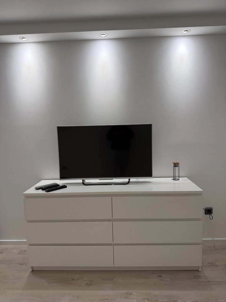 Unser Wohnzimmer ist ausgestattet mit einem 65-Zoll-Flachbildfernseher, einer gemütlichen Couch, einem Wohnzimmertisch und bietet direkten Zugang zur Terrasse.