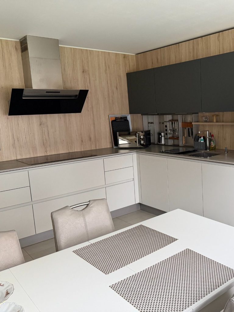 Sie verfügt über eine große Küche mit Esstisch, ein gemütliches Wohnzimmer mit Zugang zur Terrasse, zwei Schlafzimmer mit Doppelbett sowie ein modernes Bad mit Dusche.